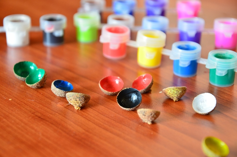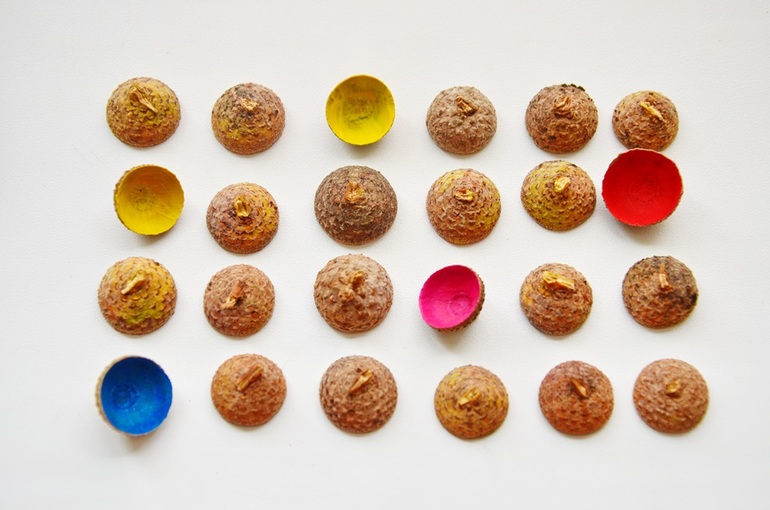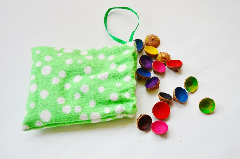 Начну с супер-невесомой вещицы - мемори из желудиных шляпок. Только-то и нужно найти примерно одинаковые шляпки, покрасить обратную сторону акриловыми или гуашевыми красками - и супер-развивашка для детей и взрослых готова! У меня 24 шляпки - 12 цветов. Играем в классическую мемори - угадываем пару.