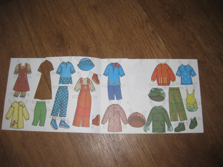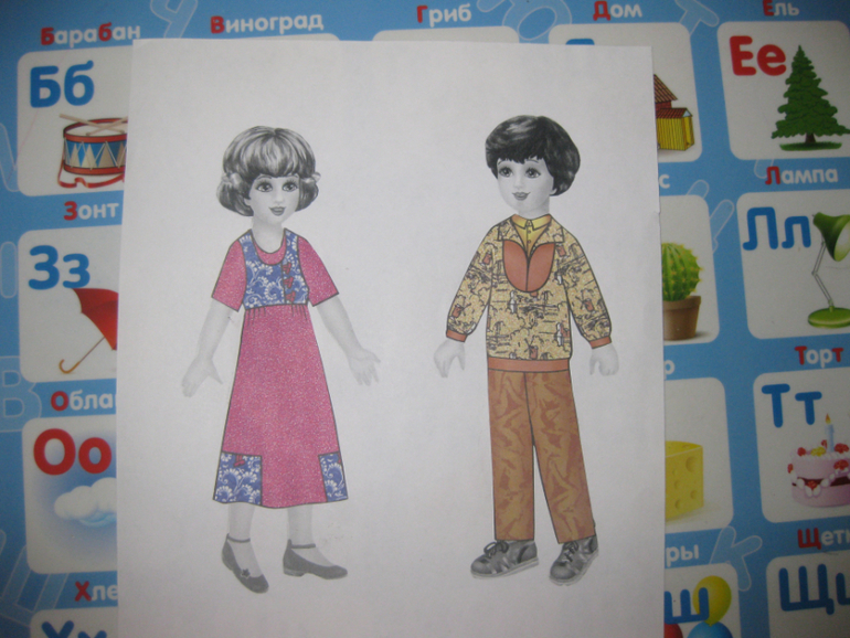 Девочку и мальчика я вырезала и откопировала в нескольких экземплярах. Одежду вырезаю по мере необходимости. Вот их мы и одеваем.