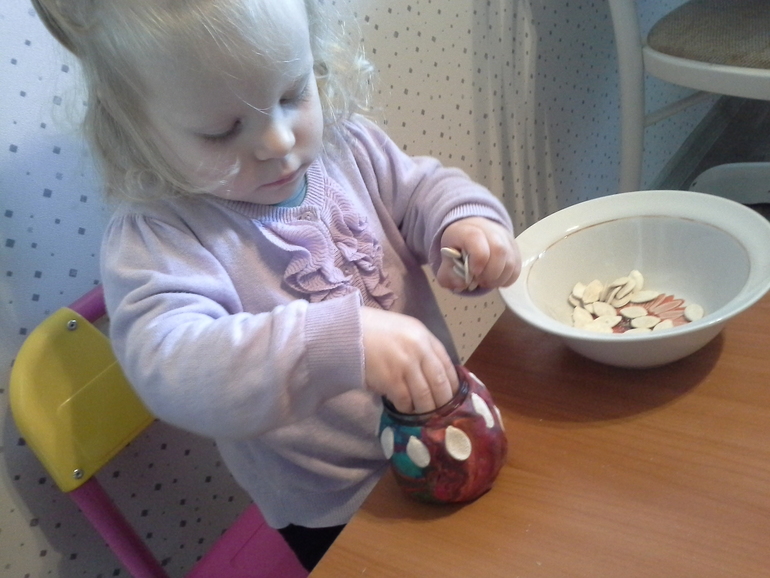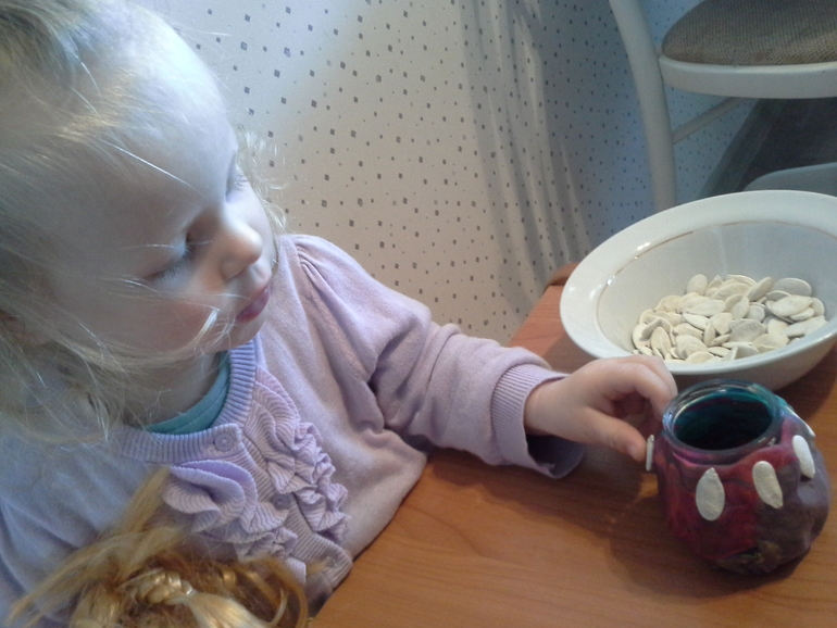 По моим планам, мы должны были поставить в вазочку осенний букетик и закончить наши игры. Но Ульяна приняла решение, что это будет не вазочка, а хранилище для тыквенных семечек. Наполняла семечками - вываливала обратно в тарелочку - и так по кругу.