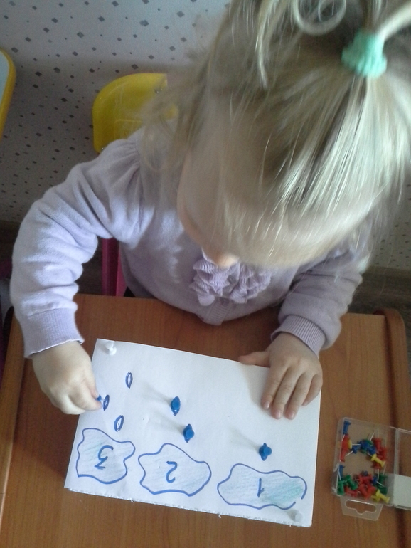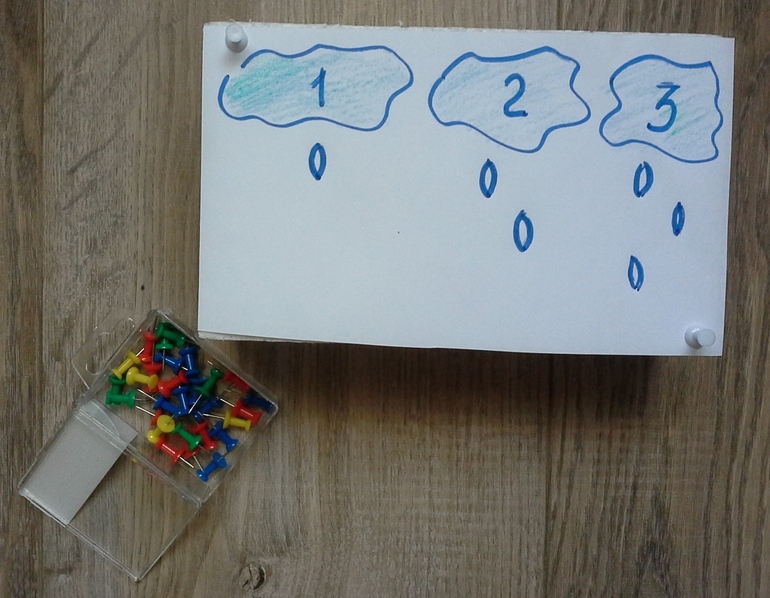 «Счётный» дождик из цветных кнопок. Из каждой тучки идет только определенное количество дождинок.