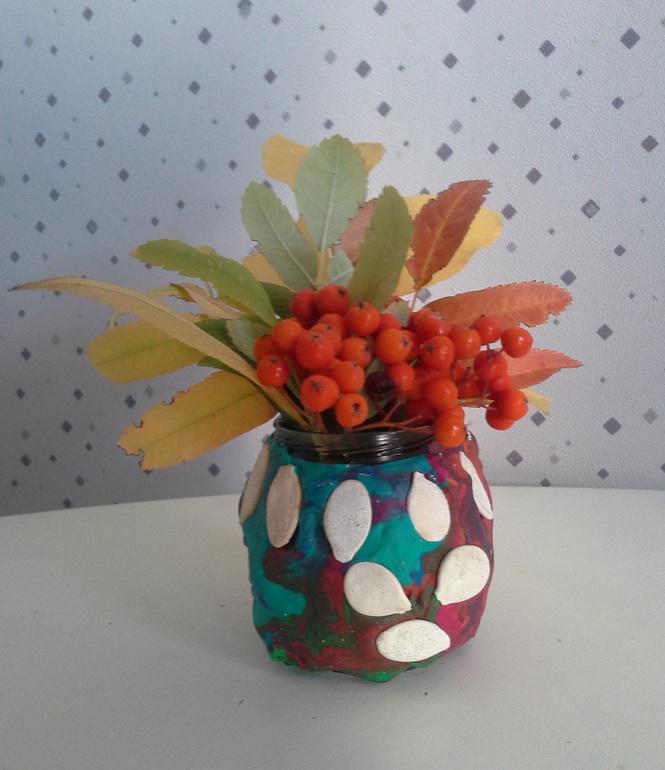 9. Делаем вазочку. Баночку из-под детского питания обклеили пластилином, украшаем тыквенными семечками.