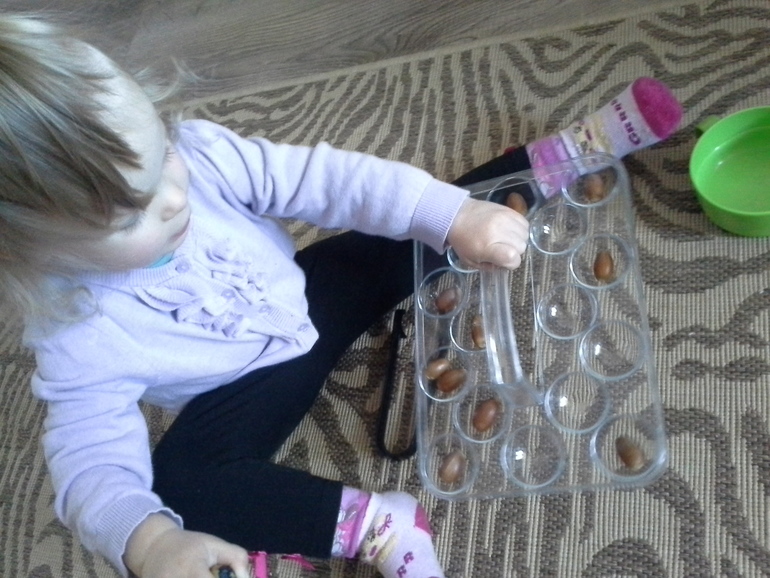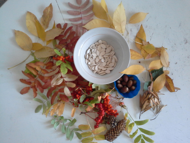 Тыквенные семечки тут уже и так были, папа ими баловался, но это же тоже дар осени, так что пришлись кстати))) Пообедали, любуясь дарами осени. А пока Ульяна спала, я придумала ей со всей этой красотой несколько игр. И вот что у нас получилось.