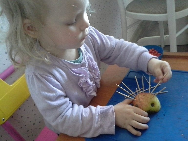 7. Делаем ёжика из половинки яблочка. Иголки - зубочистки.
