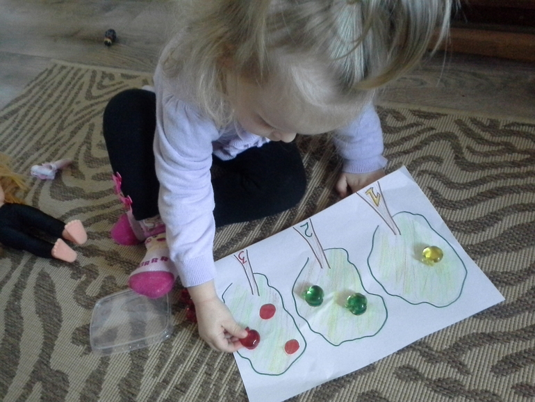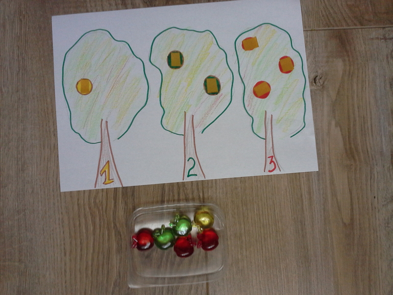 Подключаем цветовосприятие. На каждую яблоньку сажаем фикс-прайсные яблочки определенного цвета и в определенном количестве.