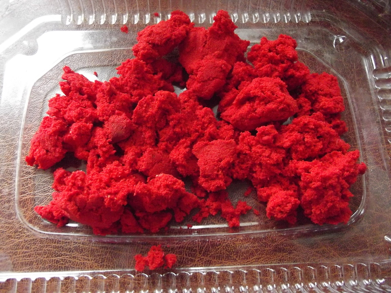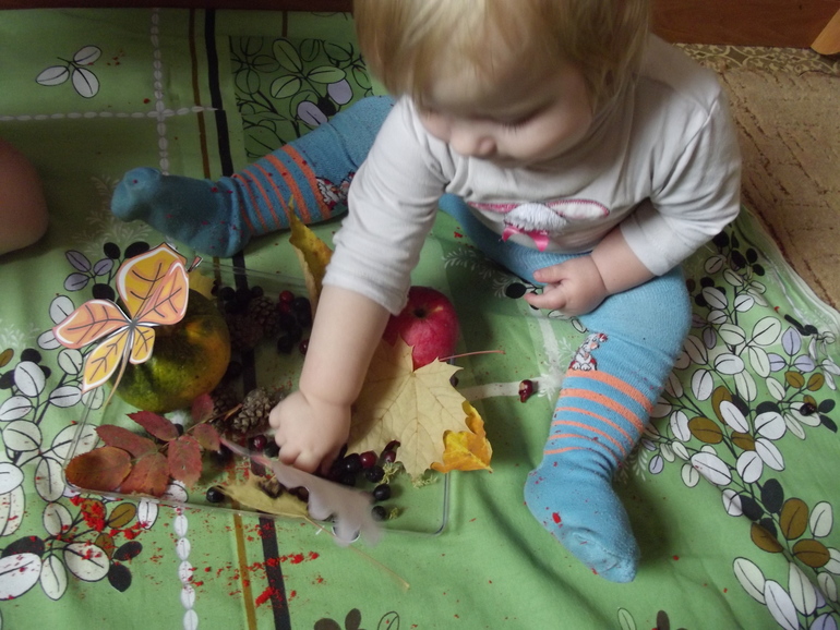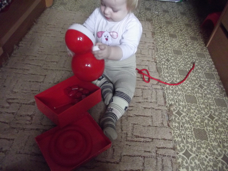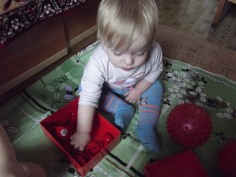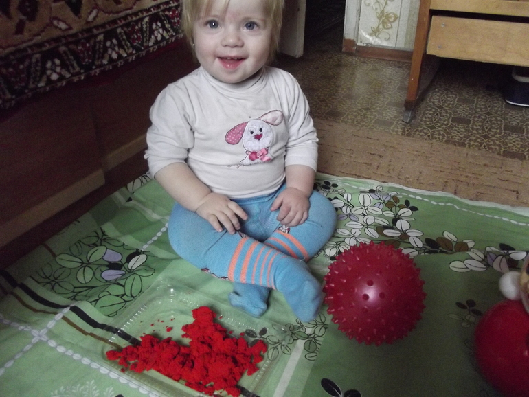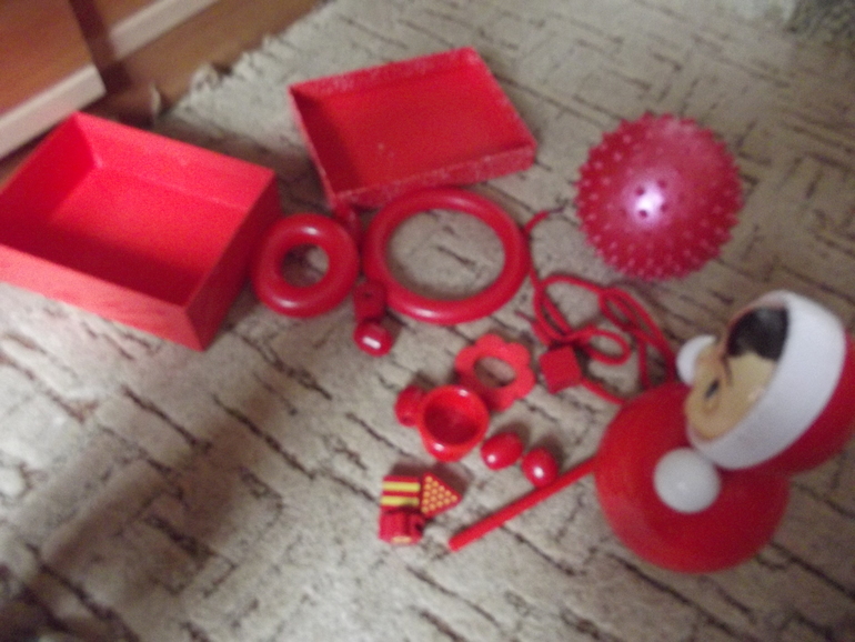 А также изучали красный цвет.В красной коробочке шарик,помидор,колечки от пирамидок,стаканчик,шнурок,бусины.Затем полепили из красного песка для лепки.