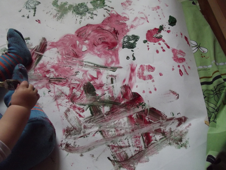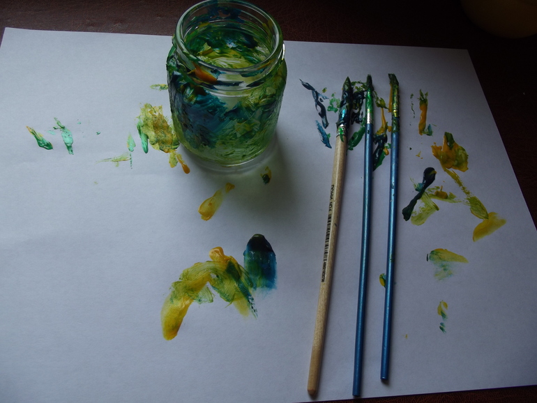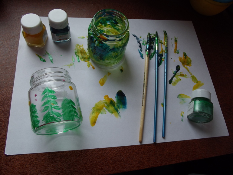 Разукрасили баночки акриловыми красками.Соня захотела елочки,а Маша поддалась фантазии.Кстати краска отлично смывается с рук.)))