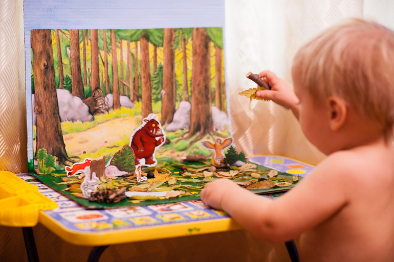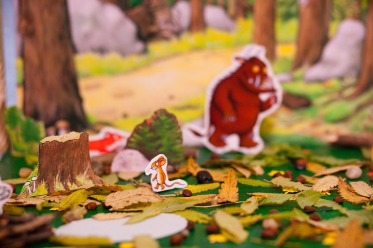 К утру краска высохла и я прикрепила к фону картинку-скан из книги Груффало. Также распечатала несколько других картинок, вырезала пенек и елки. Можно было бы побольше, но Лев поторапливал. Фигурки и елки крепились на картонную подставку (типа уголок) с помощью клея.
