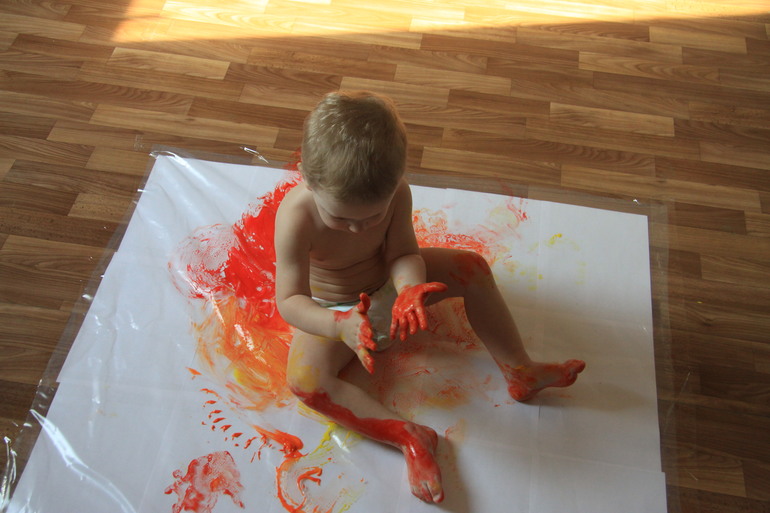 Развитие детей второго года жизниНа полу закрепила клеенку под нее бумагу и понеслось...