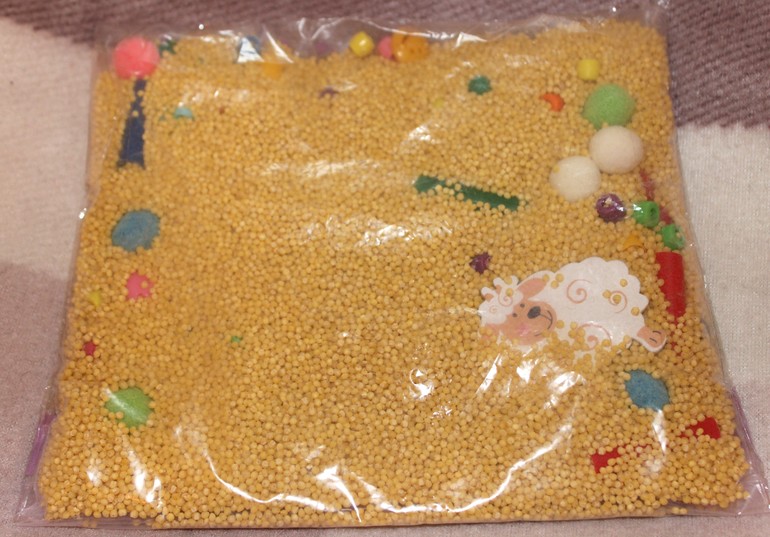 Поиграли с мешочком (пшено, пуговицы, резанные трубочки, бусинки, помпоны и что-то еще в пакете из икеа, обклеенный со всех сторон прозрачным скотчем)