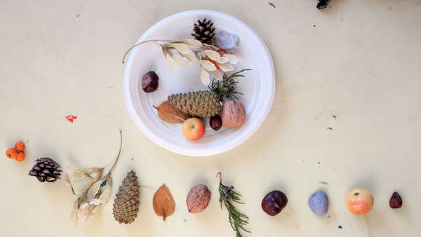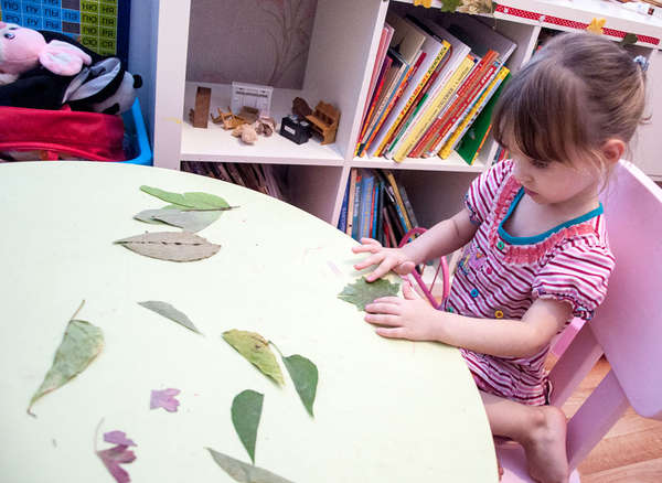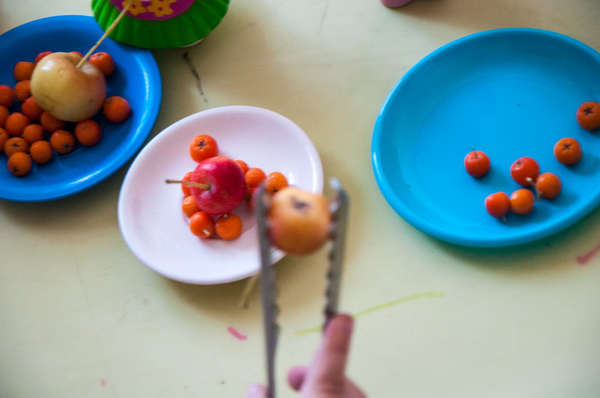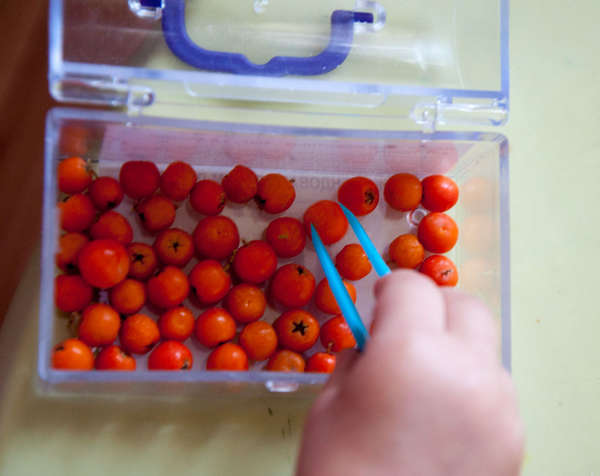 Достает пинцетом, раскладывает по тарелкам для игрушек. А потом туда же дикие яблочки пинцетом: