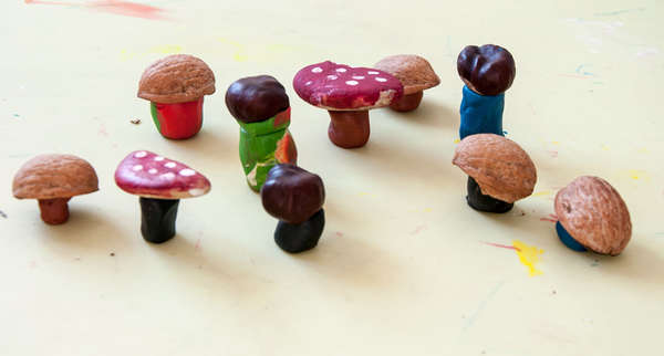 6. Из половинок орехов и каштана - грибочки. В этот же лес попали сделанные ранее мухоморы))