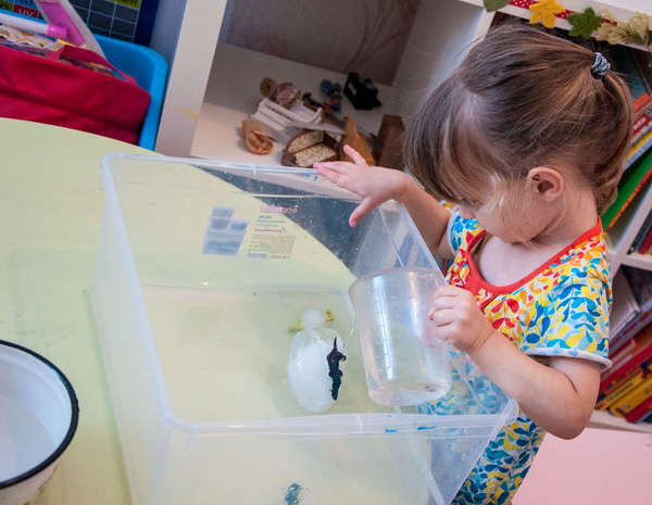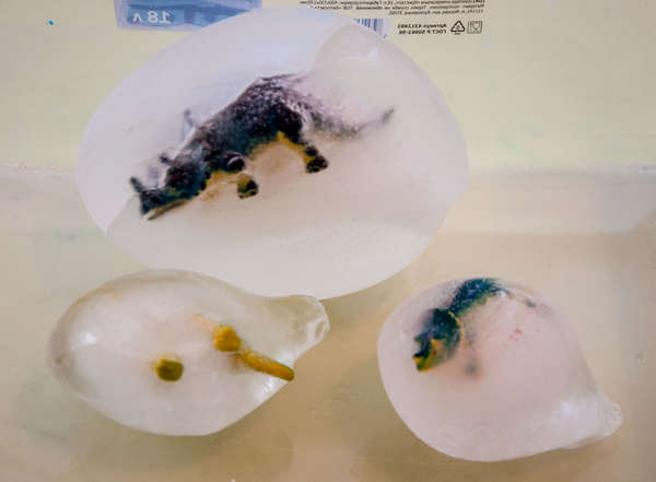 Алиса активно помогает им кипятком. Ей очень понравилось смотреть, какие дырочки горячая вода оставляет на льдинках.