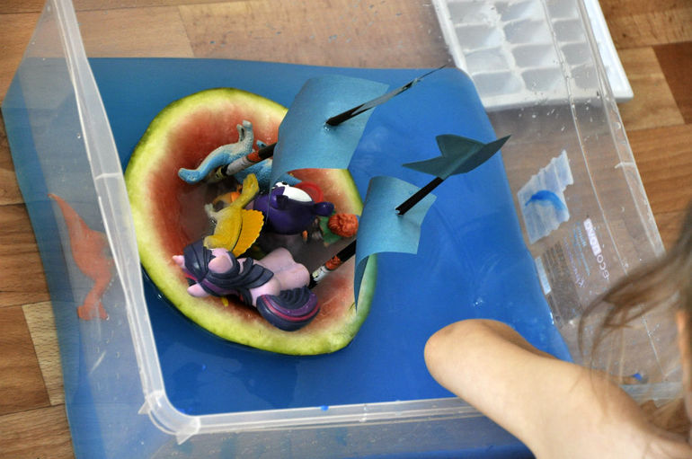 1. Кораблик из Арбуза. Ролевая игра. Алиса потом несколько раз вспоминала, и родственникам про него рассказывала. Воду просто подкрасила гуашью. Изначально планировался Северный Ледовитый океан, и в воду накидала льдинок. Но их в процессе почти не было видно:
