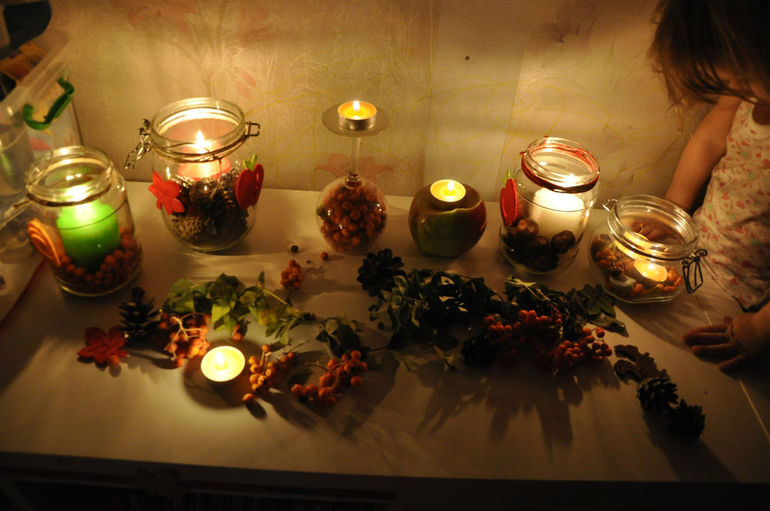 3. Это наше осеннее настроение. Из баночек, попавшихся под руку, и природных материалов сделали свечи. Вечером зажгли их, включили джаз, разговаривали. Алисе очень понравились тени на стене, она из своих рук делала собачку, зайчика, и очень этому радовалась.