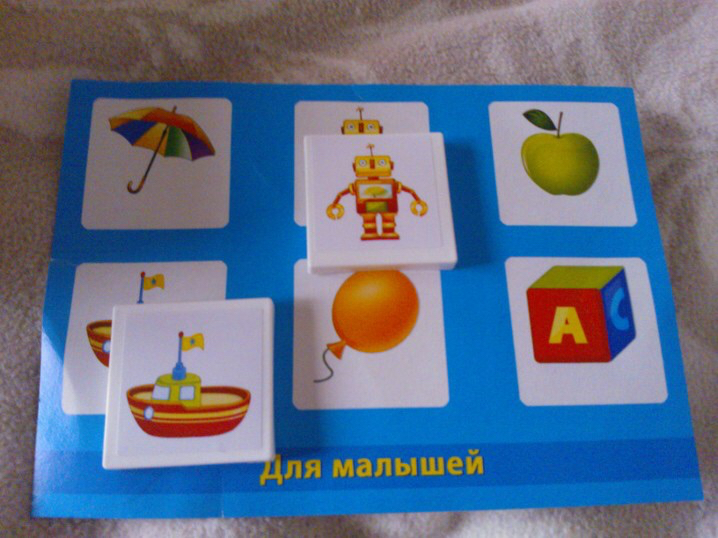Дочка сразу поняла смысл игры, безошибочно находит все изображения, но если нужной картинки нет, то все равно старается куда-нибудь положить фишку. Смешная)))