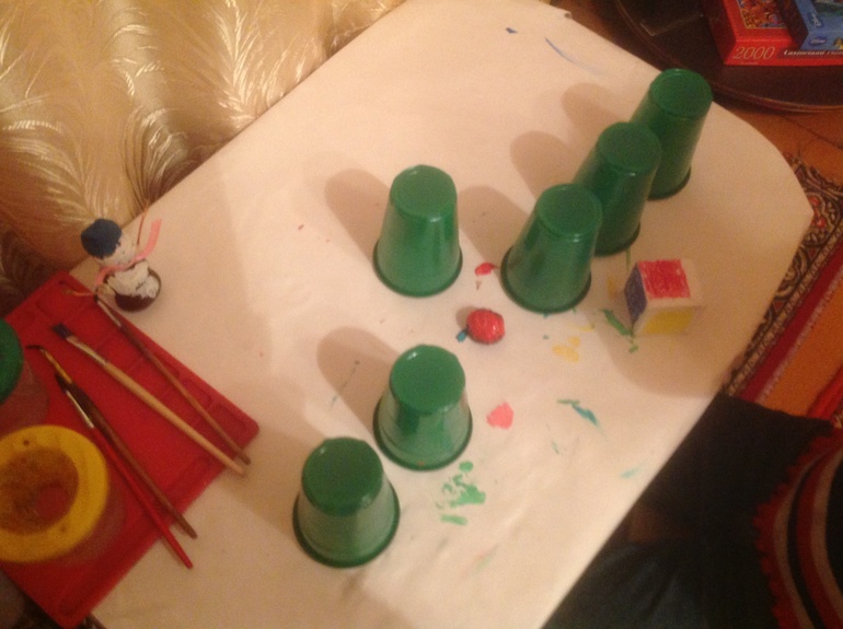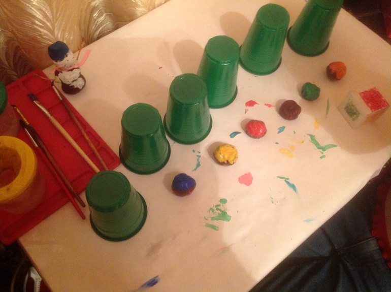 В нашем случае вместо слоников - раскрашенные каштаны, вместо тумб - непрозрачные стаканчики.