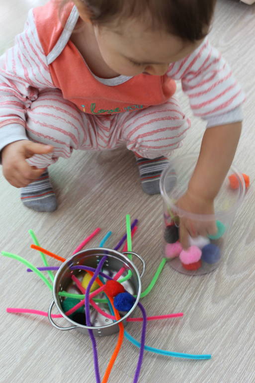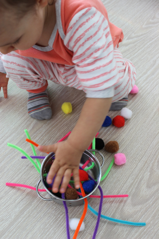 А еще мы играли с кастрюлькой в дырочку, вставив в нее синельную проволочку и закидав во внутрь помпоны. Проталкивали их пальчиками поглубже, а потом пытались вытащить. Конечно, проволочку засовывала мама =)