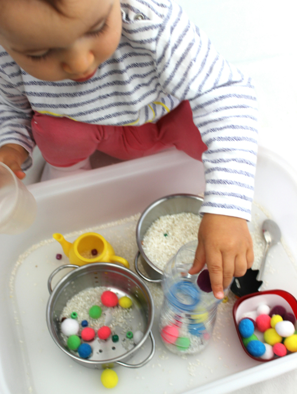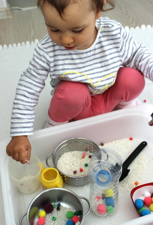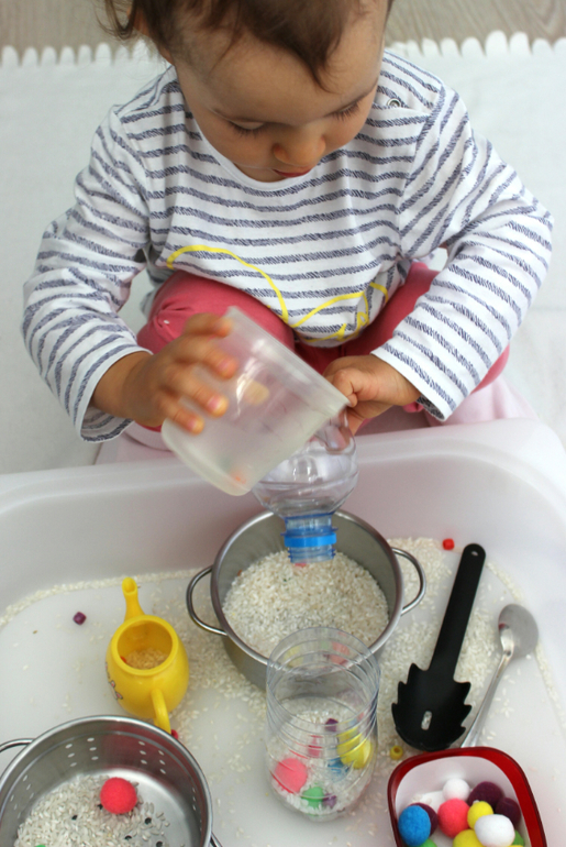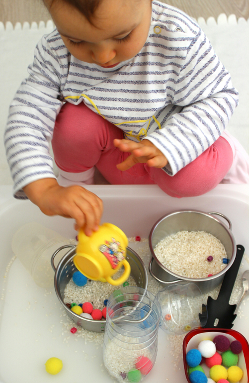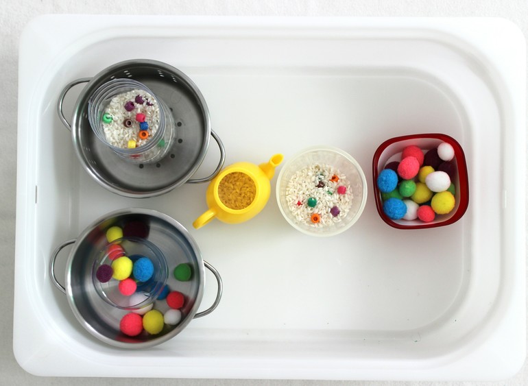 В наличии у нас мини-чайник (как оказалось, горлышко слишком тоненькое и рис через него не просыпается), две кастрюльки из набора икеа, помпоны, бусики, разрезанная бутылка 0.5 (отличная воронка получилась, а то те, которые продаются имеют слишком тонкое горлышко).