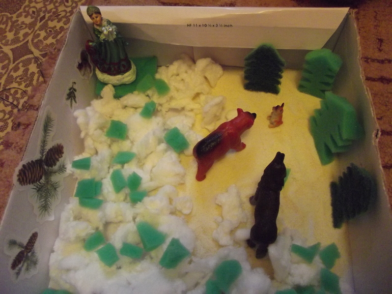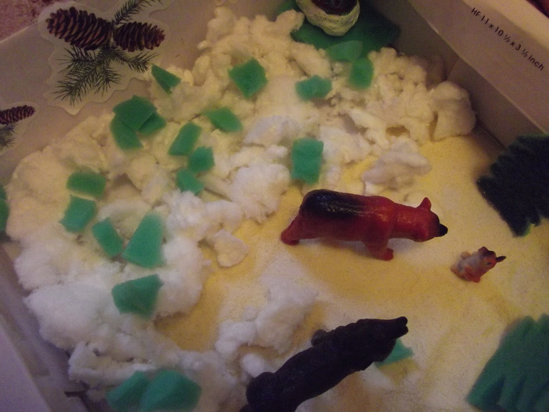 Снег из наполнителя подгузника.В нашей сегодняшней коробке он.Идея не моя.))Подгузник разрезать,вынуть наполнитель и смочить его холодной водой.Он даже скрипит.