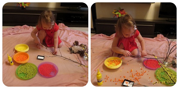 Шарики мы обычно используем для сенсорных коробок. Яночка их очень любит. В качестве материала для творчества используем первый раз. Доченька действительно увлеклась. Нужно будет еще что-нибудь придумать. В конце еще и мелкую моторику потренировали, когда пришлось оставшиеся шарики с пола собирать.