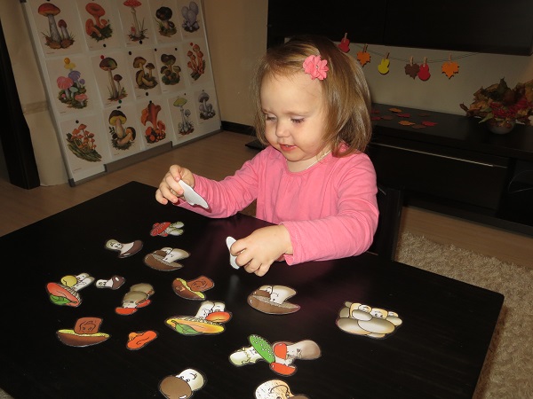 Яночка любит игры «Найди пару». Поэтому почти на каждом занятии такая игра у нас присутствует. Вот, например, ищет одинаковые грибочки. Сложность заключается в том, что некоторые пары между собой очень похожи. Но моя девочка достаточно легко справляется.