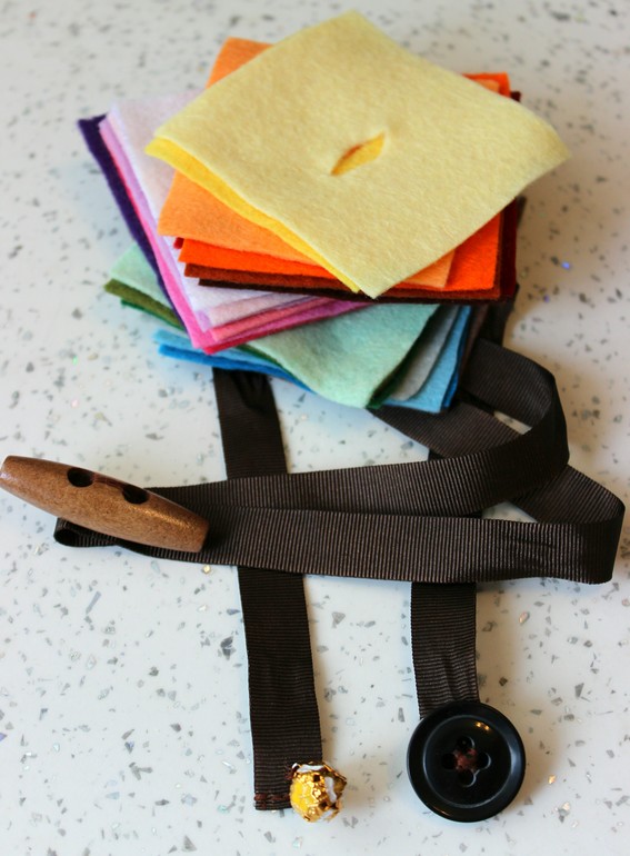 Вырезала квадраты из фетра (можно использовать и любой другой материал... его можно даже немного укрепить, если поместить между материалом картон). У меня фетра дома оказалось очень много и весь такой разноцветный, поэтому мы еще и по цветам изучаем эту "игрушку". Я его ничем не укрепляла и никак не подшивала (края имею ввиду). Сделала в середине каждого квадрата дырочку.
