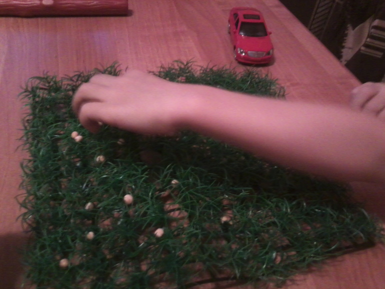 Посадили мы горошек, он взошел. Но взошло с ним много сорняков (сорняками была травка из фикс-прайса). Задание - достать горошинки из травы. Предлагалось испольовать пинцет. Оказалось, что пользоваться пинцетом ооочень сложно, будем тренироваться. Так что перешли на доставание пальчиками.