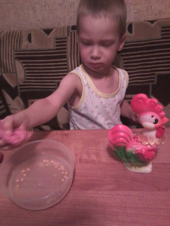 Из горошка мы сварили супчик. Задание - достать горошек из миски с супчиком при помощи мерной ложечки (ложка от хлебопечки) и переложить в тарелочку петушку.