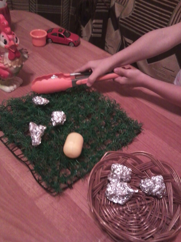 Петушок на радостях приготовил Филе сюрприз, завернул его в оберточку, а мама, чтобы Филю запутать подбросила много еще оберточек. Задание - равернуть фольгу и найти "подарочек" от петушка. Все развернули, нашли золотое яичко. Его снес петушок.