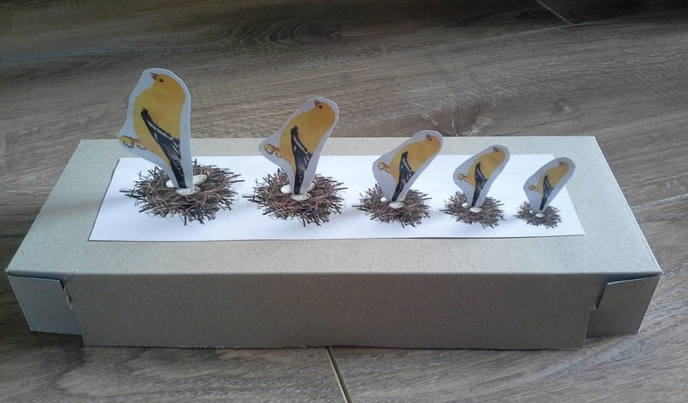 А к плоскости перейти можно таким образом. На нашем весеннем ФМ было задание разложить птичек по гнёздам в соответствии с размером. Я знала, что Ульяна не будет этого делать…Тогда я сделала игру, которая актуальна у нас до сих пор. Взяла крышку от коробки, наклеила на неё гнёзда, а в них сделала прорези…Птички прилетют и садятся в гнёзда нужного размера…
