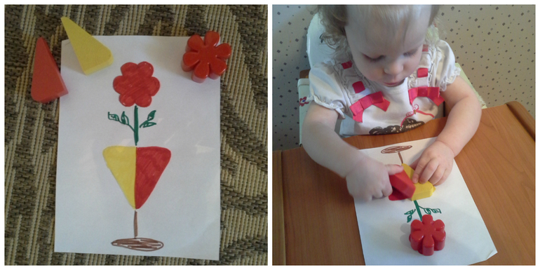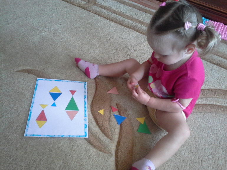 До 2 лет танграм классического вида сложен для ребенка, но правила можно объяснять уже сейчас. Хороший вариант - накладывание объёмных предметов на плоскую картинку. Например, так