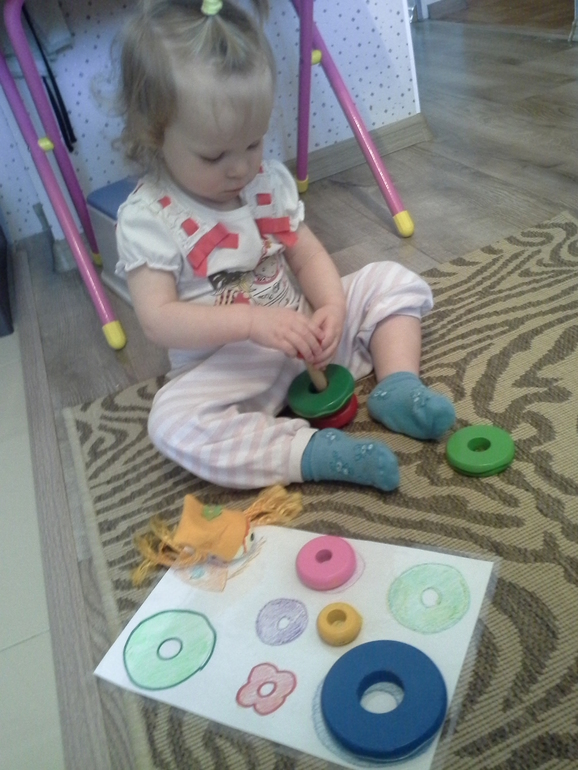 Или вот задание посложнее, сразу и на определение размера и цвета. Лото из пирамидки. Обводим контуры колечек от пирамидки, разукрашиваем в нужный цвет. Выдаем ребенку пирамидку и просим разложить колечки на нужные изображения.