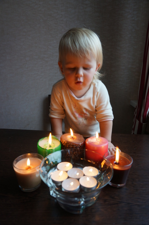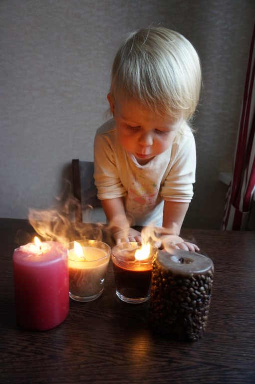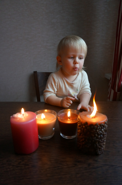 Развитие детей второго года жизниКогда Маша была поменьше ее очень увлекало задувание свечки. Сейчас она постарше, на улице холодно, а у нас на столе "очаг", от которого так тепло и уютно! задувает почти разом, так что две свечи на торте в январе для нас не проблема!