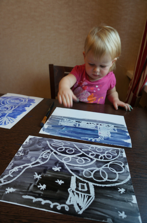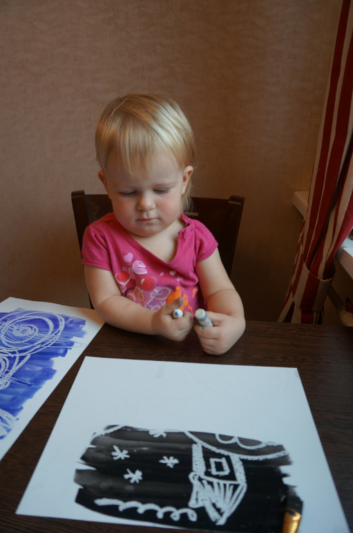 Развитие детей второго года жизниВ детстве я очень любила этот фокус - проявление воскового мелка на бумаге через акварельную краску! Это всегда эффектно и красиво! Пришло время удивлять Машу, тем более за окном зима и мы поглощены ею. На белой бумаге белым восковым мелком я рисовала снеговика, снежинки, снежный пейзаж, а дочке ничего не было видно, но стоило нам взять темную акварель, как стали происходить чудеса!