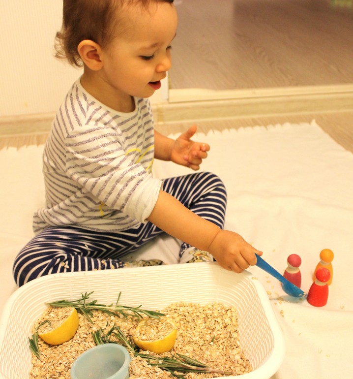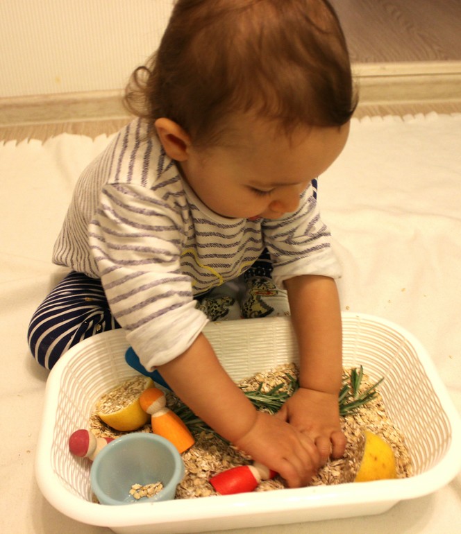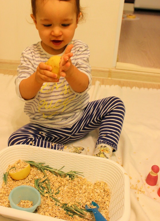 Лимон: потрогать сердцевину, расковырять ее, вытащить косточки, рассмотреть их, популяться ими (ну это уже мама забавлялась), выдавить сок прямо на овсянку и посмотреть как она становится липкой/взкой, облизнуть сок, разорвать шкурку (цедру), обвалять вторую половину лимона в овсянке, а потом счищать это руками или ложкой, нюхать лимон, повтыкать розмарин в сердцевину (веточки мягкие, поэтому этим занималась я) ... может и еще что-то можно, но на этом с лимоном мы закончили.