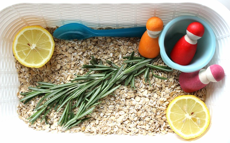 Готовила на днях рыбу и осталось у меня довольно много свежего розмарина. Лимон то у всех дома есть, поэтому с этим вообще никаких проблем =) И вуаля, готова новая коробка для игр: овсянка, лимон, ветки свежего розмарина и наши друзья Grimms =)