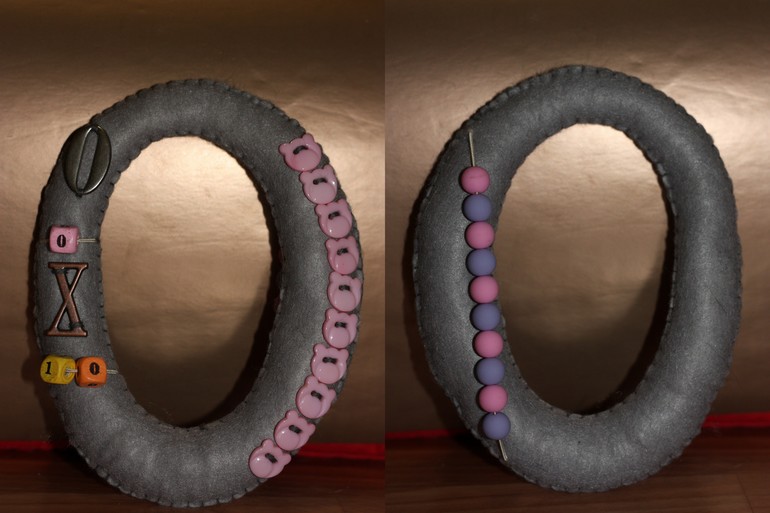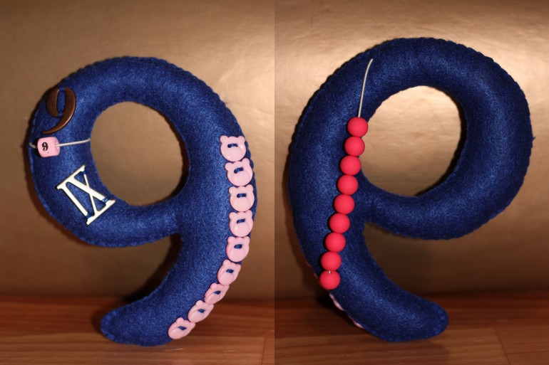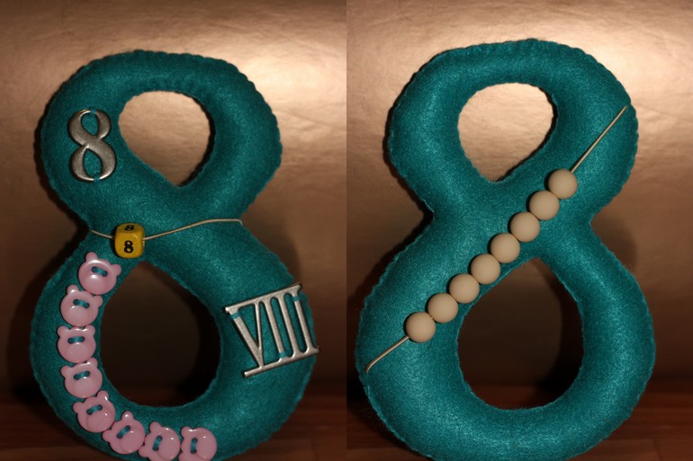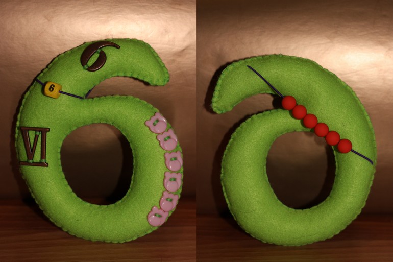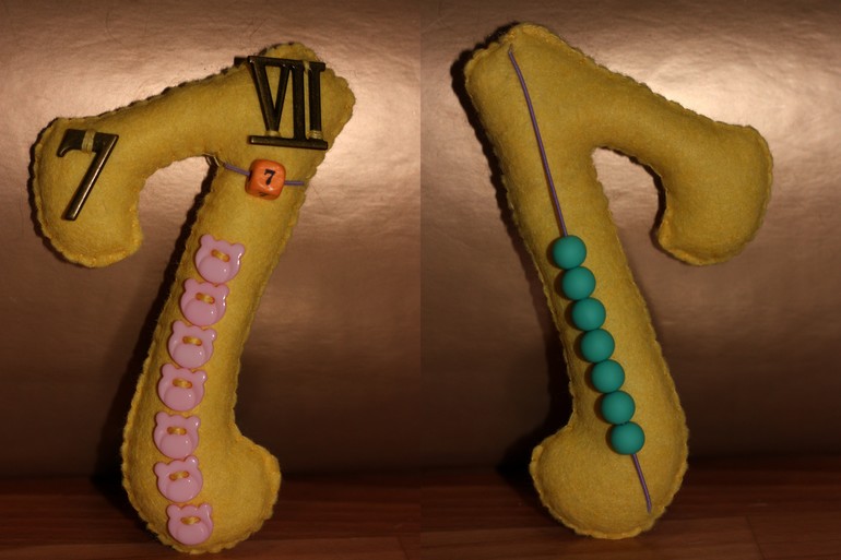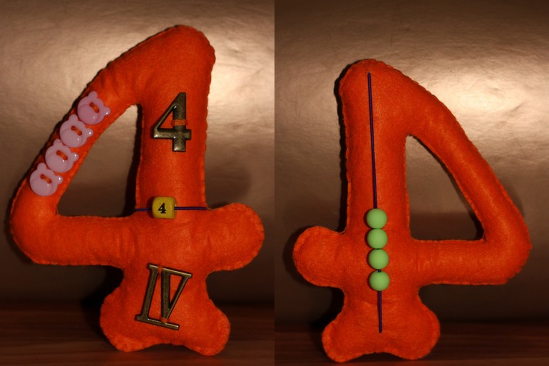 Каждая цифра в формате а5, поэтому ее удобно держать в руке, да и мелкие я не люблю))) С лицевой стороны на цифре арабская и римские ее обозначения, а также пуговички и бусина -цифра на резинке. С обратной стороны цифры бусины на резинке. Использовала погремушечные резинки, так как с ними удобно работать, они хорошо тянутся, не рвутся и имеют тонкое сечение. Бусины хотела использовать деревянные, но потом в магазине увидела матовые и , как кинестетик, просто влюбилась, уж очень они приятные на ощупь.
