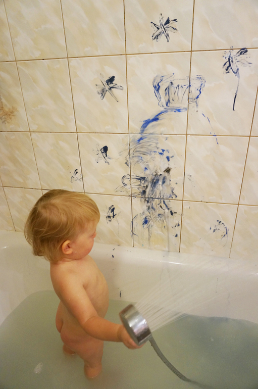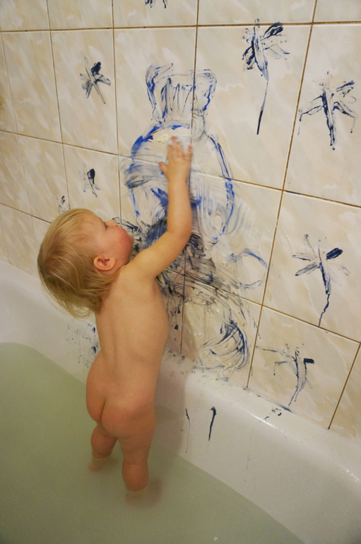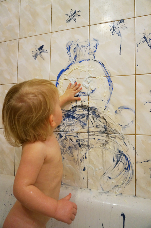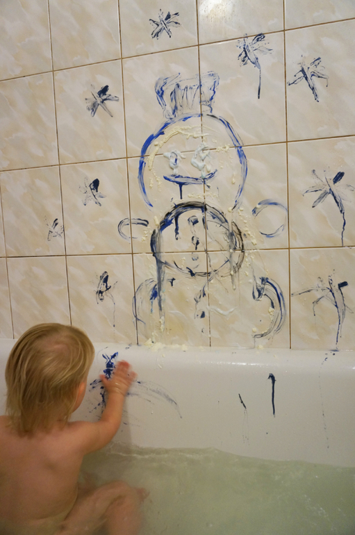 Развитие детей второго года жизниОбычно Маша очень любить принимать ванну, а тут как-то уселась за мультики и не хотела идти мыться. Пришлось сказать, что в ванне ее ждет сюрприз! Я нарисовала снеговика при помощи пальчиковых касок, взбитых сливок из баллона и папиного геля для бритья. Герой получился на скорую руку, но привел дочь в восторг! Мы долго его мазюкали, а потом мыли душем, и от снежного героя не осталось и следа!