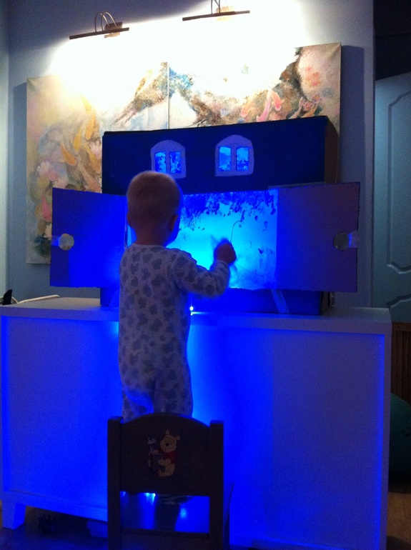 После обеда, мы вместе приготовили праздничный пирог. А пока пирог остывал, я попросила мужа увлечь ребенка в другой комнате и быстренько организовала декорации в " уставшем" доме, закинула внутрь светодиодную гирлянду, зажгла свечи, погасила свет и пригласила мальчиков на представление. И опять... Нужно было видеть этот взгляд... Нужно было слышать эти вопли восторга... Марсу так понравилось, что он весь оставшийся вечер проиграл с этим домиком. Он переселил туда всех своих зверей , он носился по дому размахивая гирляндой, как американский дикий ковбой с лассо. Опять же, он забирался в домик сами кричал оттуда громко "ку-ку"! Потом ему показалось, что он девид коперфильд и стал ломиться через боковые стены домика на ружу. К ночи домик уже погибал:)