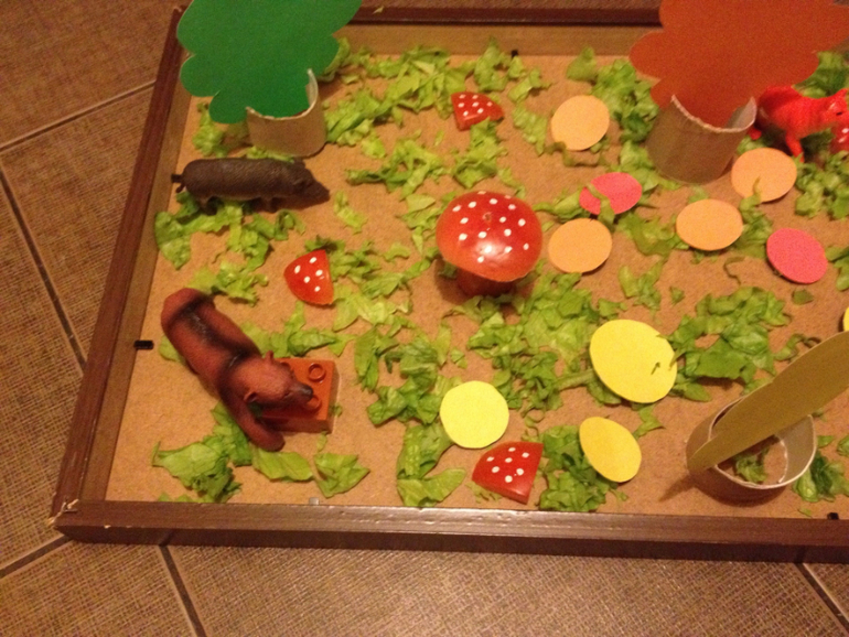 В лиственной части росли мухоморы, за пеньком спрятался медведь, а кабан хрустел желудями (желуди я потом положила, сфоткать не успела). А в звойной части на кустах росли ягоды, а на пеньке белка ела орешки, которые она решила припрятать почему-то именно здесь. За белкой удивленно наблюдал олень) В нашем лесу была одна особенность: там было очень много в его съедобного, specialy для моего всеядного сына. Трава - из салата, мухоморы - из помидоров, ягоды и орехи - натурпродукт) поэтому мы не только рассмотрели и покормили животных, но и сами перекусили