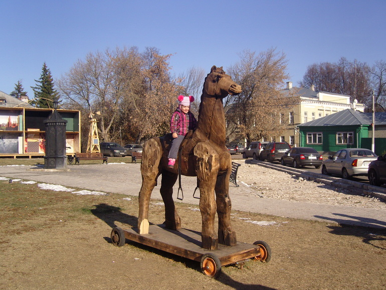 Итак, мы приехали в город за час до назначенного времени экскурсии и о чудо! Напротив Фабрики пастилы стоит огромный конь! Там мой ребенок и провел все время)