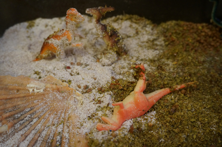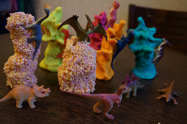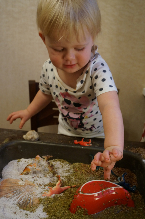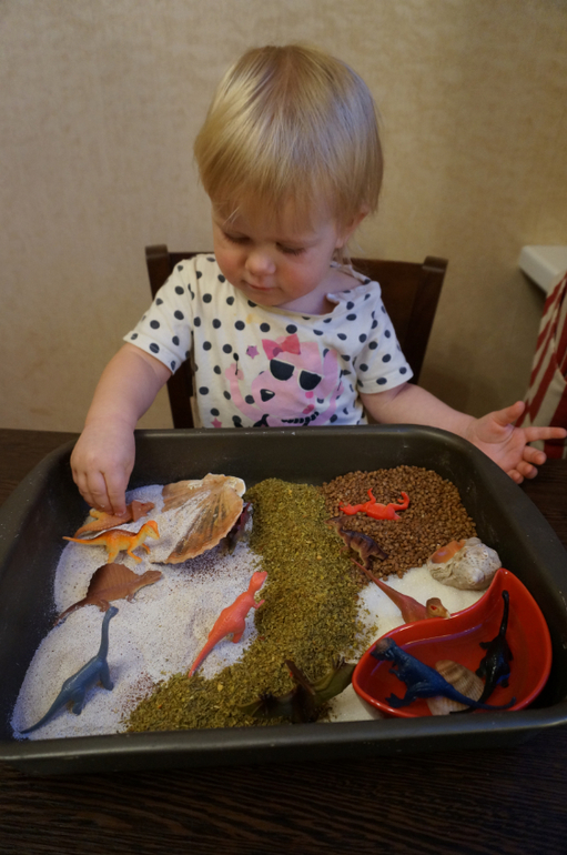Коробка наполнилась гречей, сахаром, растворимым кофе 3 в 1 и травами-приправами. Маша решила, что динозаврам нравится болото и быстро вылила воду из резервуара для купания, получилась прекрасная жижа!