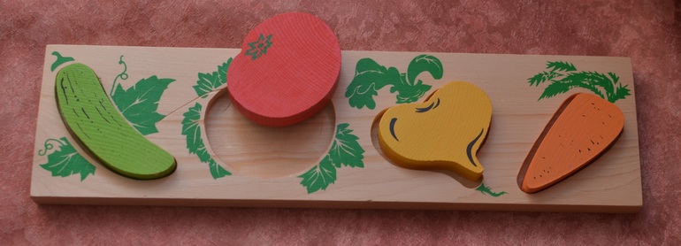 Дочке очень нравится вынимать "овощи" из ячеек, причем порядок у нее всегда одинаковый: красный помидор, зеленый огурец, оранжевая морковка, желтая репка. Видимо по цветам ориентируется (зато мы теперь знаем, какие цвета у нее в фаворе). НО доча в том возрасте, когда все пробуем на зуб, и конечно же каждый из этих деревянных и покрашенных неизвестно какой краской овощей мы жуем, жуем, жуем... (если мама не успеет отобрать).