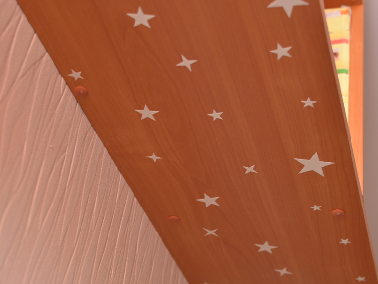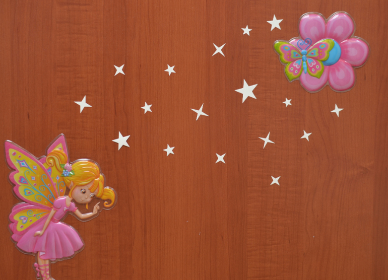 Еще до рождения дочки, мечтала купить светящиеся звезды и приклеить их на потолок (видимо потому что в детстве у меня их не было). Реализовала свою детскую мечту: приклеила и на потолок, и на стены, и на книжные полки