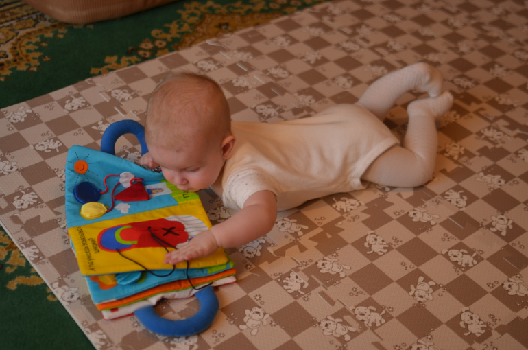 Сомневалась, стоит ли покупать, так как дорого казалось (около 1т.р.) для 10 страниц, но после покупки ни разу не пожалела. Ни один день у нас не обходится без этой книжки: играем с пчелкой и бабочкой (см.фото), развязываем и жуем шнурки (см.фото), ищем осьминожку, расстегиваем и застегиваем молнию. И главное, что мы еще долго сможем использовать эту книгу, так как мы пока не умеем: расстегивать пуговицу и ремень, подбирать правильную форму и цвет, считать ножки у гусеницы, говорить сколько времени, а это все есть в книжке!