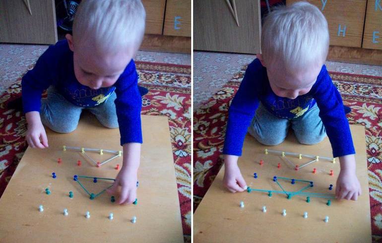 Развивающие игрушки своими рукамиДоска, силовые кнопки + молоток - и вуаля, очередная развивалка для сына готова! Осталось достать резинки и играть