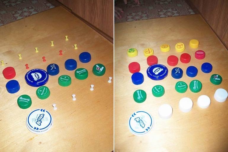 А еще Максим, как любитель всё подбирать по цветам, придумал с доской новую игру: подбирает под цвет кнопки нужную крышечку. Изобретатель растёт!