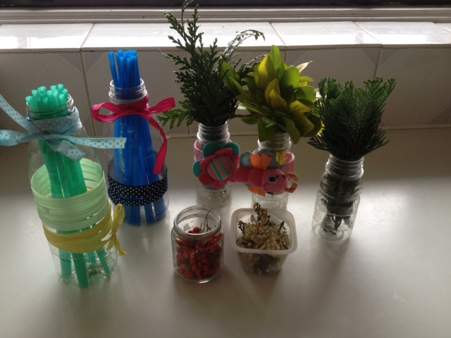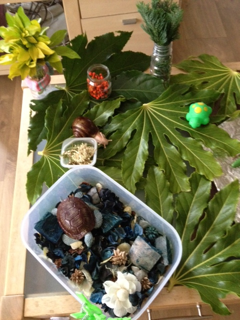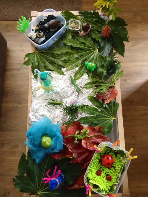 Дочка почти не играет магазинными игрушками, но очень любит все природные материалы (шишки, листья, цветы), пластиковых насекомых - улитку, кузнечика и т.д., игры с перебиранием всего подряд типа соломок для коктейлей и разные тактильные ощущения. Решила сделать для нее несколько игр, чтобы точно понравилось. Это задумки на несколько дней, в таком виде она стол не видит, для 10 мес слишком много сразу впечатлений.