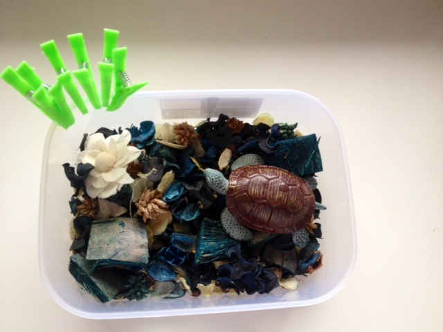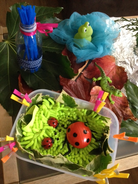 Дочка очень тактильная, поэтому я стараюсь использовать разные материалы. Я добавила фольгу, хлопковую мочалку с кисточками, фетр, саше, капрон. Помимо моторики задействуем еще сенсорику - разный аромат от листьев, ели, саше.