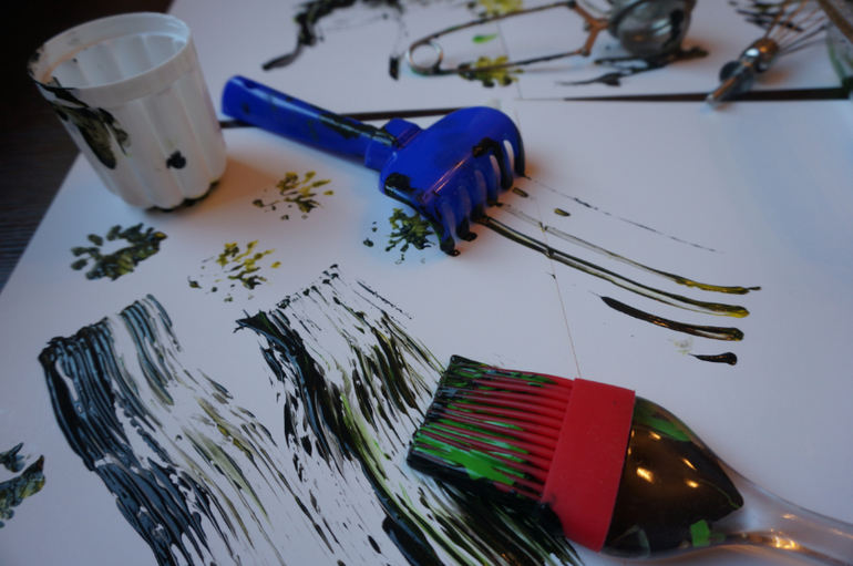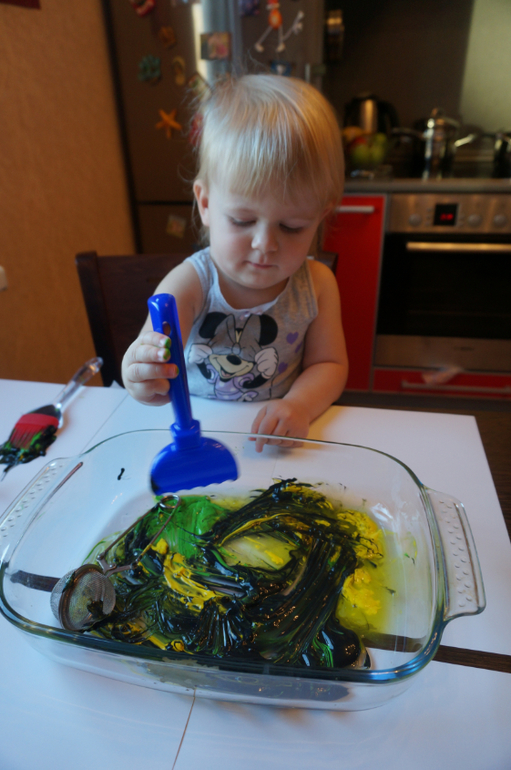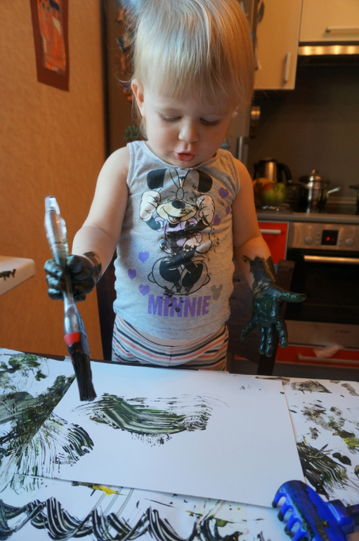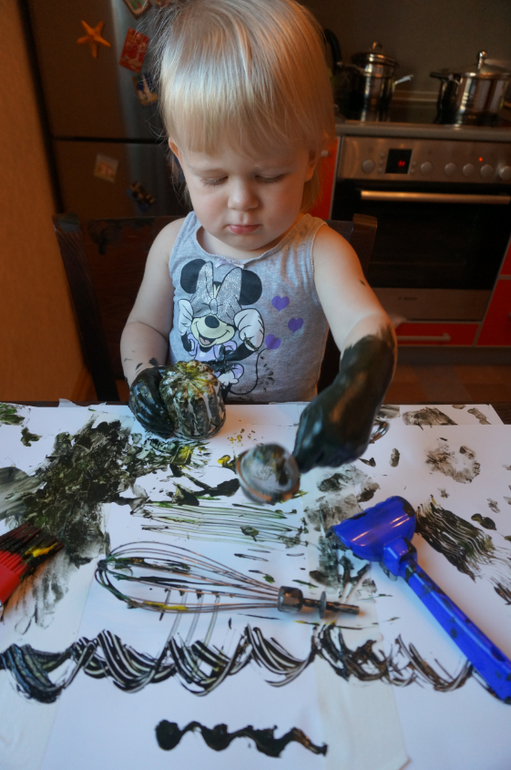 Развитие детей второго года жизниВ раннем возрасте процесс есть результат. Мы с Машей продолжаем пробовать разные виды творчества и рисования! На этот раз взяли кухонную утварь - венчик, кисть для выпечки, пробку от сливок, детские грабли, заваривалку для чая и пальчиковые краски.Линии получались причудливые, но самым любимым занятием пока остаются "перчатки" из краски и отпечатки ладошек!
